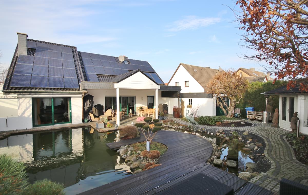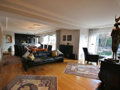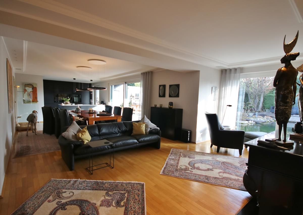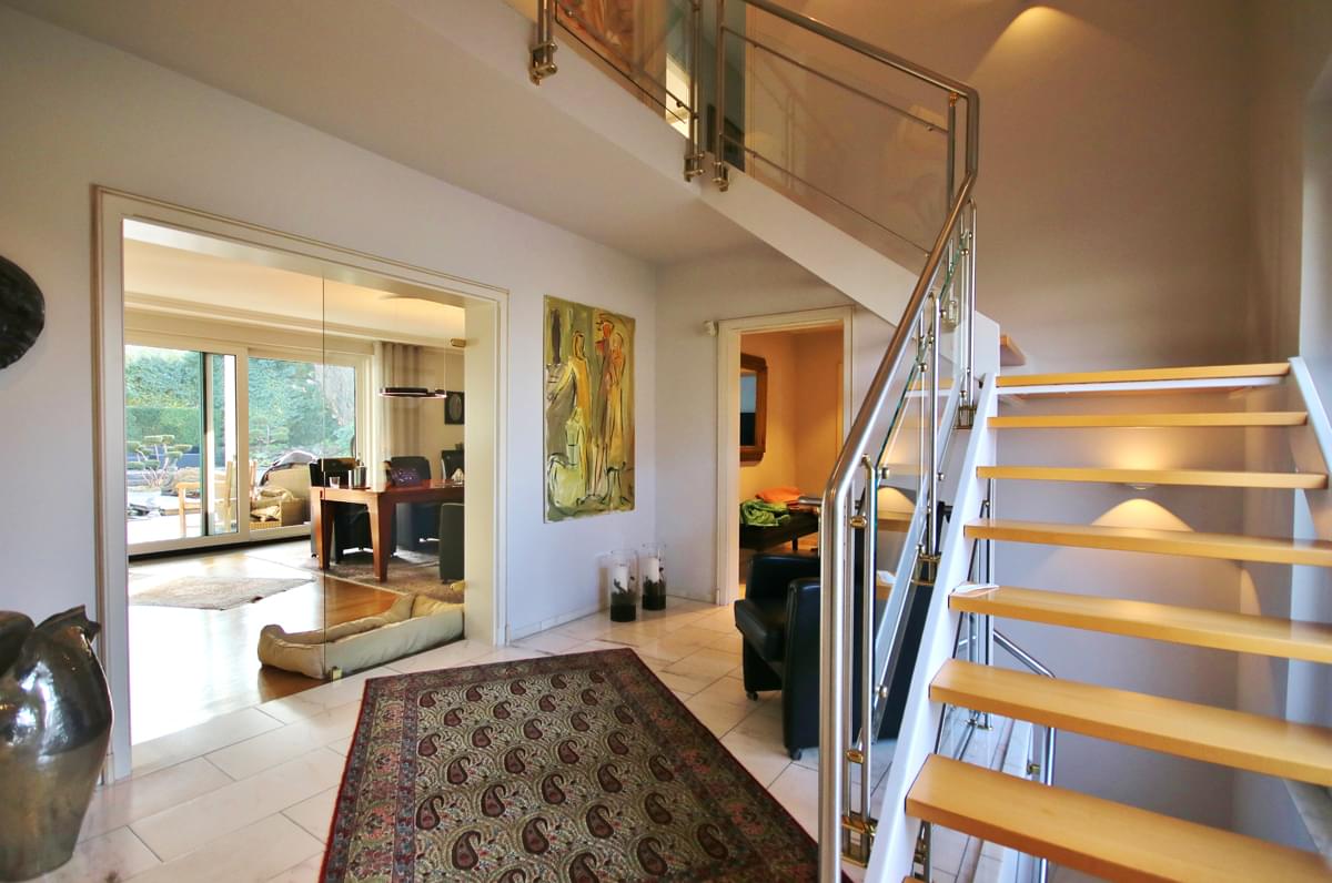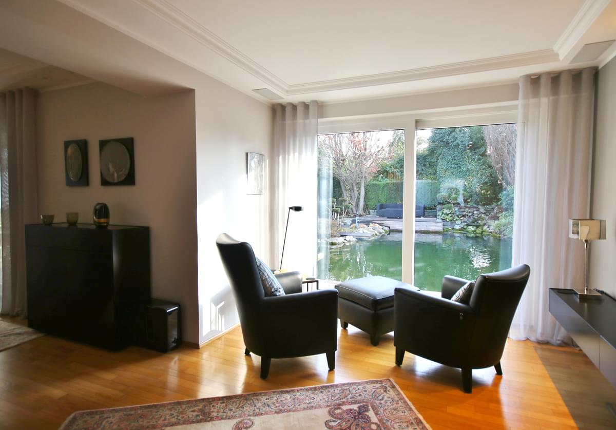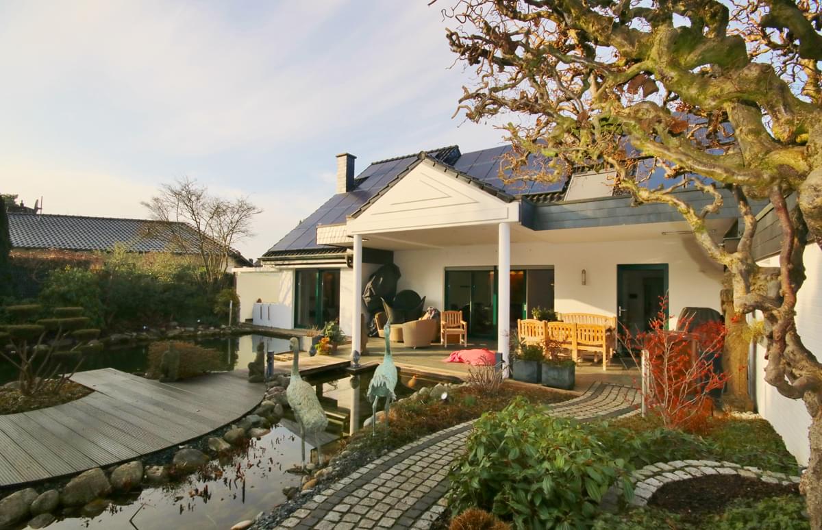 Grundstück wurde gartenarchitektonisch gestaltet, inklusive eines Schwimmteichs und einer Terrasse, was die Privatsphäre und die Ästhetik des Außenbereichs unterstreicht. Die Immobilie wurde kontinuierlich auf hohem Niveau modernisiert, um ein stilvolles und hochwertiges Wohnerlebnis zu gewährleisten. Das Haus besticht durch eine hochwertige technische Ausstattung, die ein nachhaltiges und modernes Wohngefühl schafft.