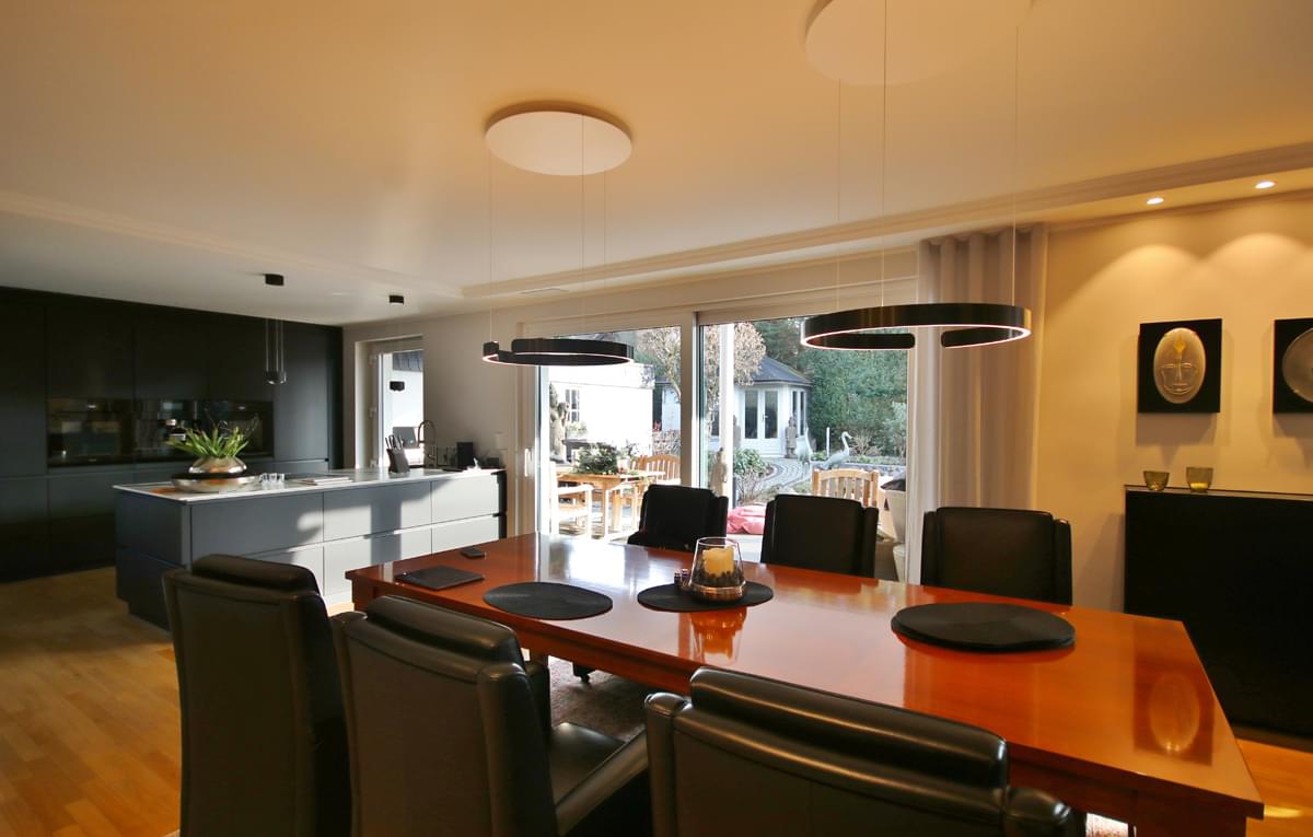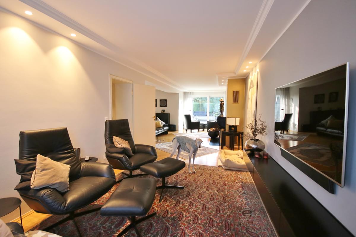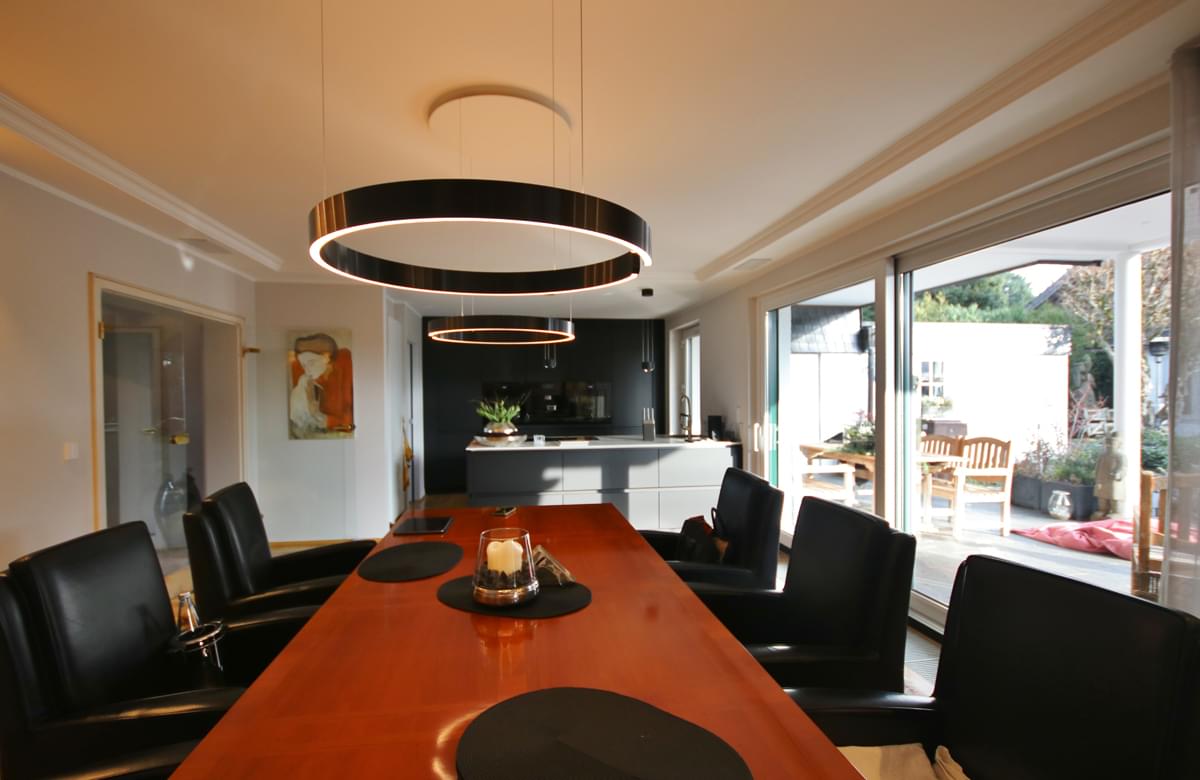 größtem Stilempfinden neu gestaltete Erdgeschoss umfasst eine moderne puristische offene Küche mit hochwertigen Einbaugeräten, eine Vorratsküche, moderne Elektro -, Licht - und Netzwerktechnik (Bussystem) sowie ein maßgefertigtes Interieur.