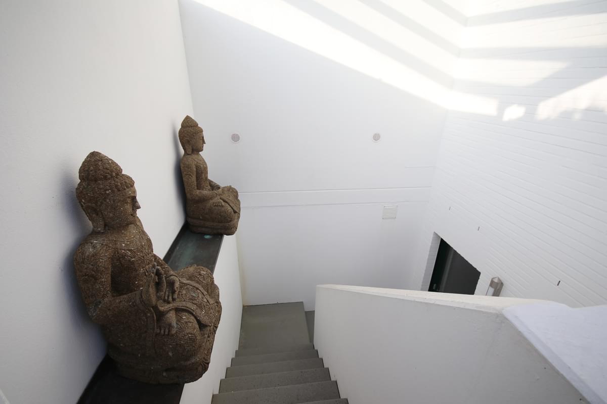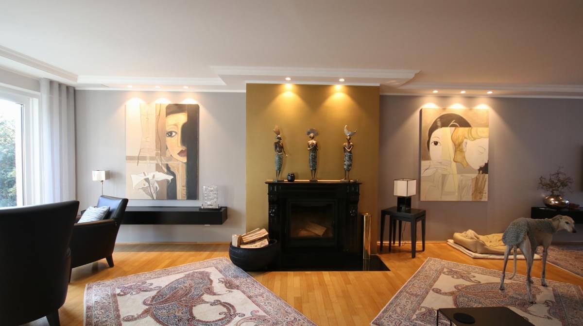 Der Eingangsbereich ist durch ein elegantes Vordach geschützt und führt in eine großzügige Diele. Eine offene Treppe mit Glasbrüstung verbindet das Erdgeschoss mit der Galerie und den Räumen im Obergeschoss und führt auch hinunter in das Souterrain. Das gesamte Erdgeschoss ist offen gestaltet, mit einem lichtdurchfluteten Wohn – und Essbereich, der durch bodentiefe Fenster über die tief überdachte Terrasse einen Blick in den Garten mit Wasserflächen und Sitzplätzen bietet. Gäste-WC und Garderobe fügen sich harmonisch in die Eingangsdiele ein. Ein Kamin, gerahmt in einer schwarzen Marmormaske aus der Zeit Philipp III, sorgt für Wärme und stilvolle Akzente. Das mit