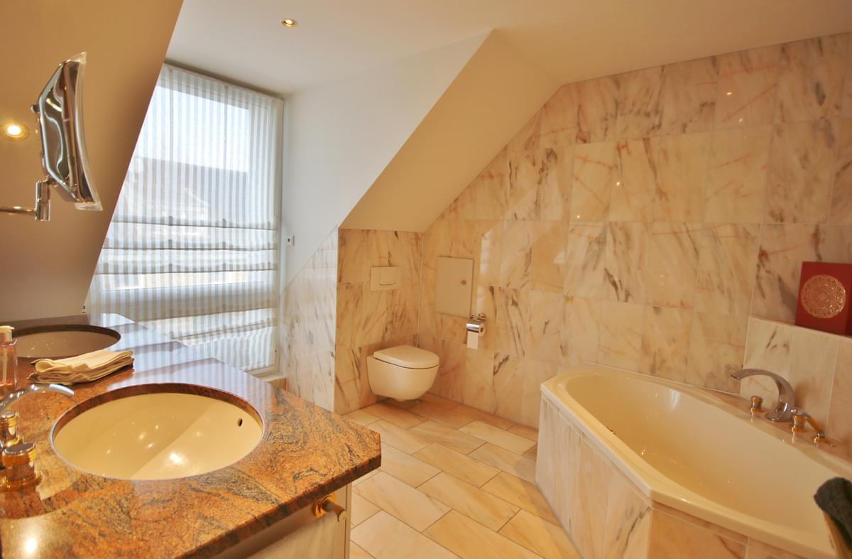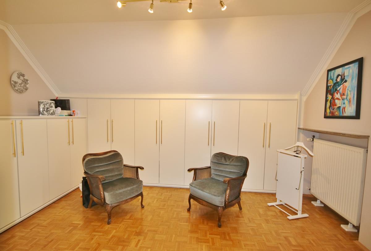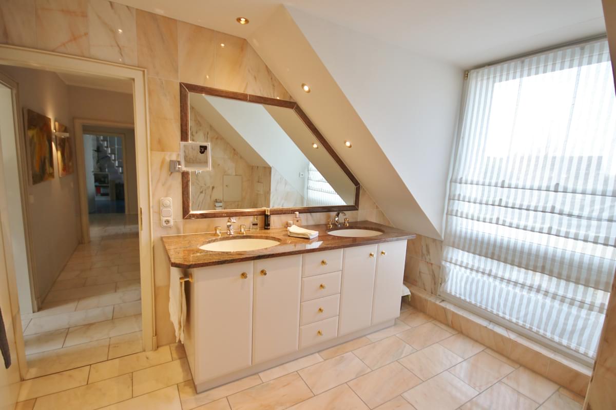 Die privaten Rückzugsorte im Obergeschoss bieten neben dem gemütlichen Elternschlafzimmer mit Ankleidezimmer, zwei weitere großzügige Räume, die flexibel als Kinder- oder Gästezimmer genutzt werden können und einen begehbaren Kleiderraum. Maßgefertigte Einbauten bieten viel Stauraum. Das stilvolle Wannenbad mit Tageslicht und hochwertiger Ausstattung wie Marmor und Doppelwaschtisch bietet Komfort und Funktionalität. Die Raumgestaltung legt Wert auf Privatsphäre und eine angenehme Wohnatmosphäre.