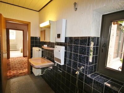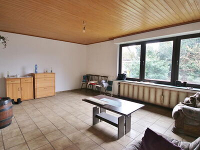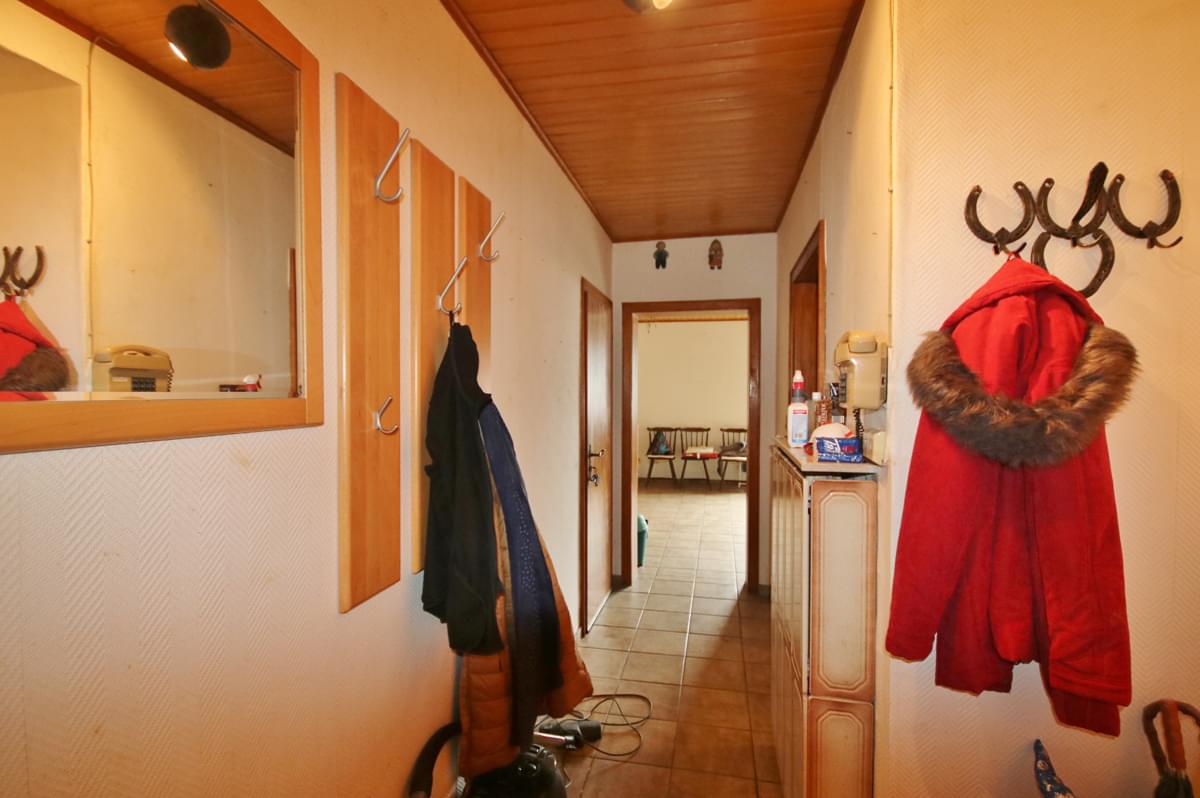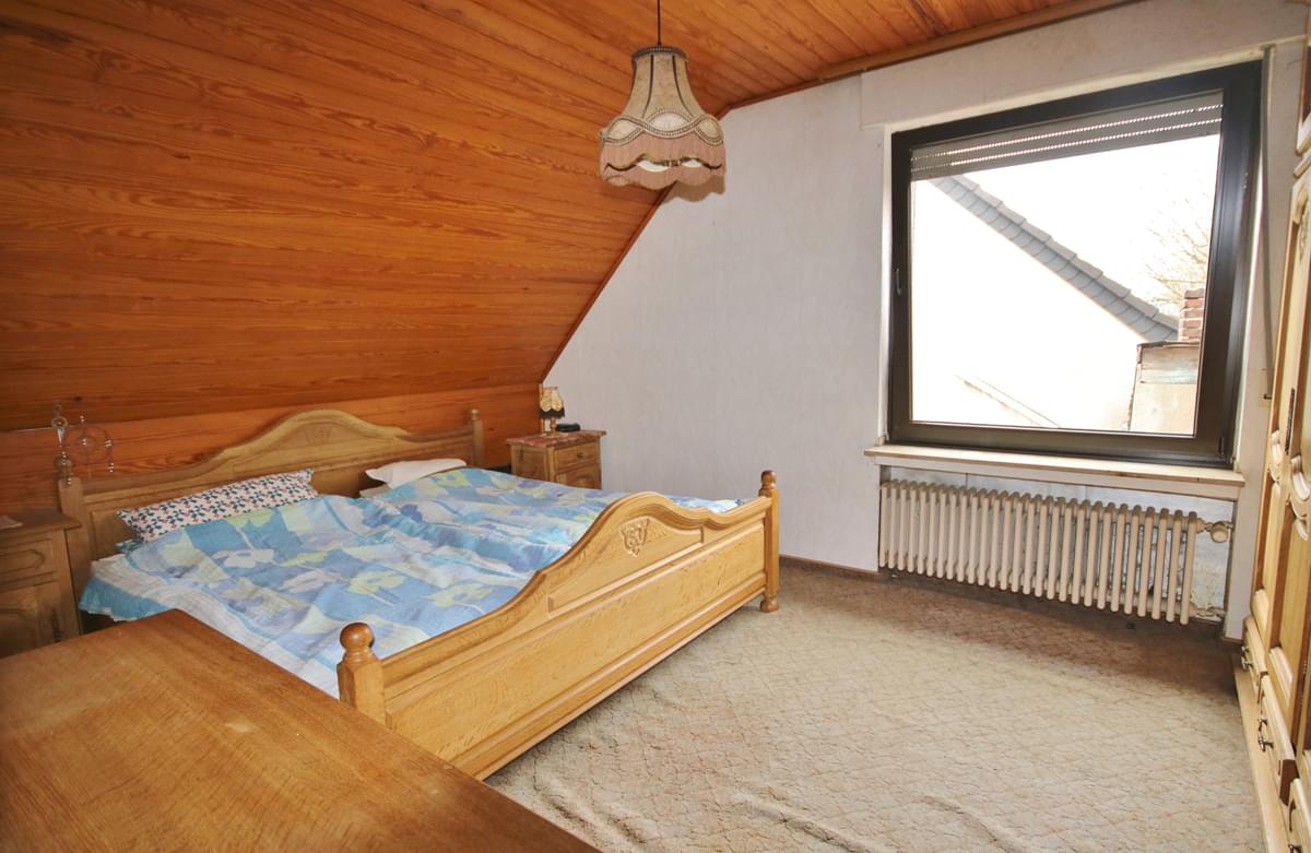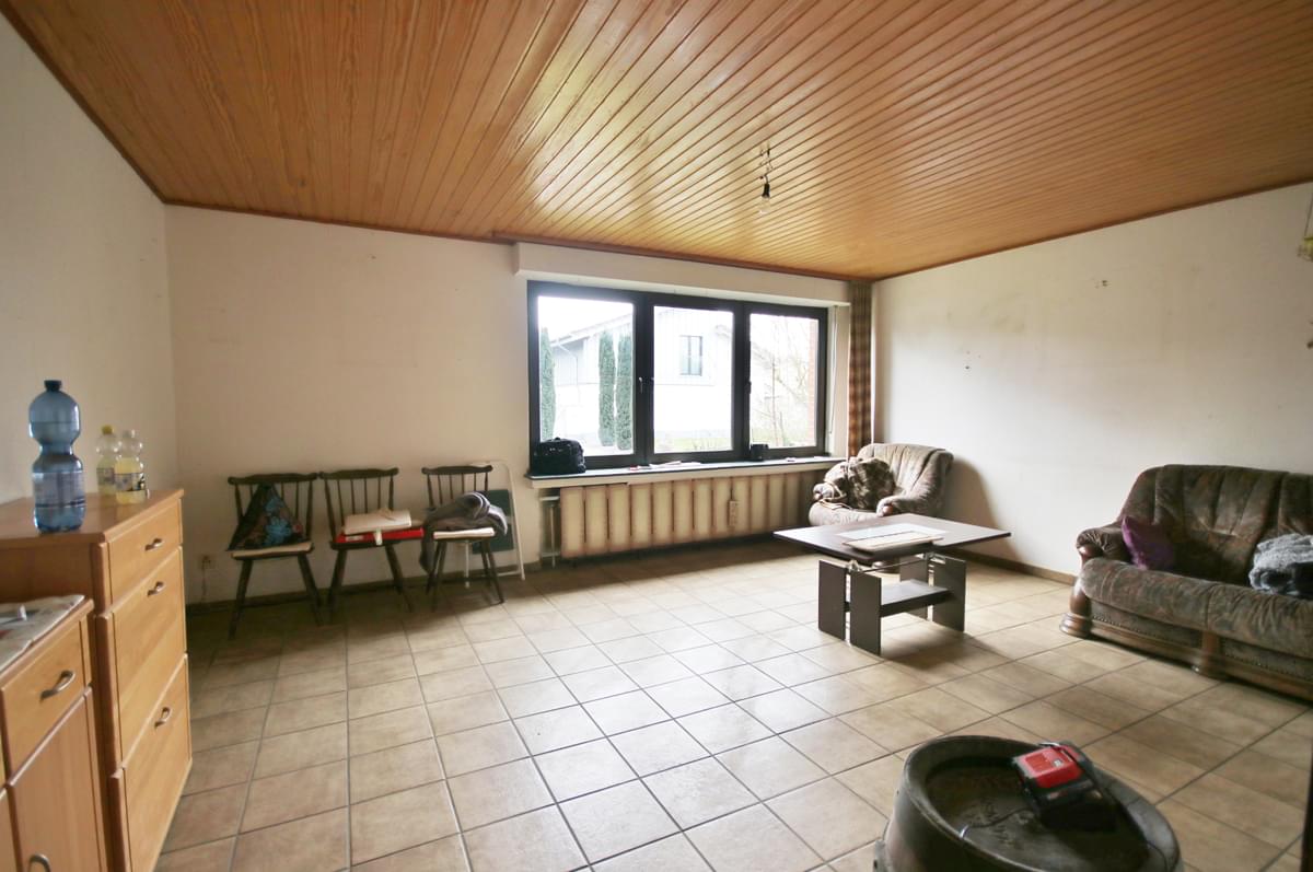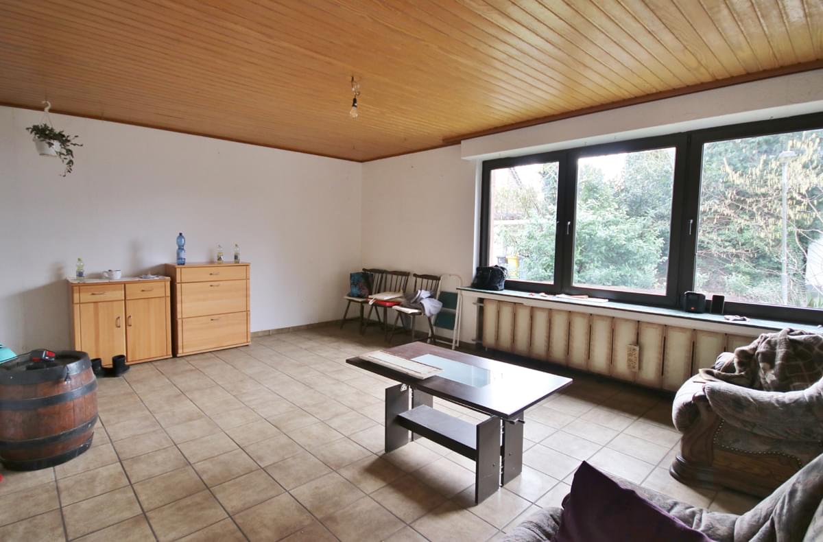 Die angebotene Immobilie wurde 1967 in konventioneller anderthalbgeschossiger massiver Bauweise mit Satteldach, Unterkellerung und zwei Garagen als Zweifamilienhaus errichtet. Auf dem Grundstück befindet sich neben diesem Haus noch ein weiteres Einfamilienhaus mit Garage, Schuppen und Scheune. Die Einfahrt sowie die Freifläche des Grundstücks werden von drei Parteien genutzt. Die Wohnung, im Aufteilungsplan mit Nr. 1 bezeichnet, verfügt über einen separaten Hauseingang im hinteren, überdachten Bereich des Hauses. Im Erdgeschoss befinden sich ein Flur mit Garderobe, Gäste-WC, Zugang zum Treppenhaus, die Küche und ein großzügiger Wohnraum. Über das gemeinsame Treppenhaus gelangen Sie in die privaten Räume des Obergeschosses, bestehend aus mit Diele, Wannenbad, einem Schlafzimmer mit Balkon und zwei weiteren Räumen, die individuell genutzt werden können. Es bestehen vielfältige Nutzungsmöglichkeiten, beispielsweise den Aufgang ins Obergeschoss durch eine Wendeltreppe in den Wohnraum zu verlegen, eine eigene Zufahrt mit Stellplatz für ein zweites Fahrzeug von der Straße aus bis zur Haustür zu realisieren oder einen Wintergarten zu errichten. Aufgrund von Krankheit wurde die Immobilie in den letzten Jahren etwas vernachlässigt, weshalb eine Renovierung der Wände, Böden und des Gäste-WCs empfehlenswert ist.