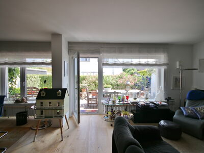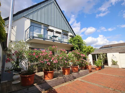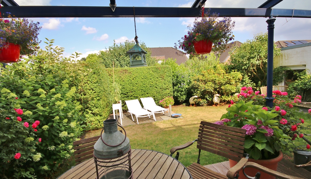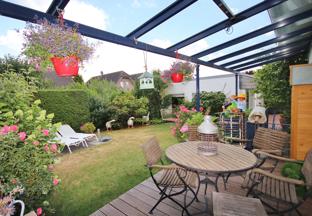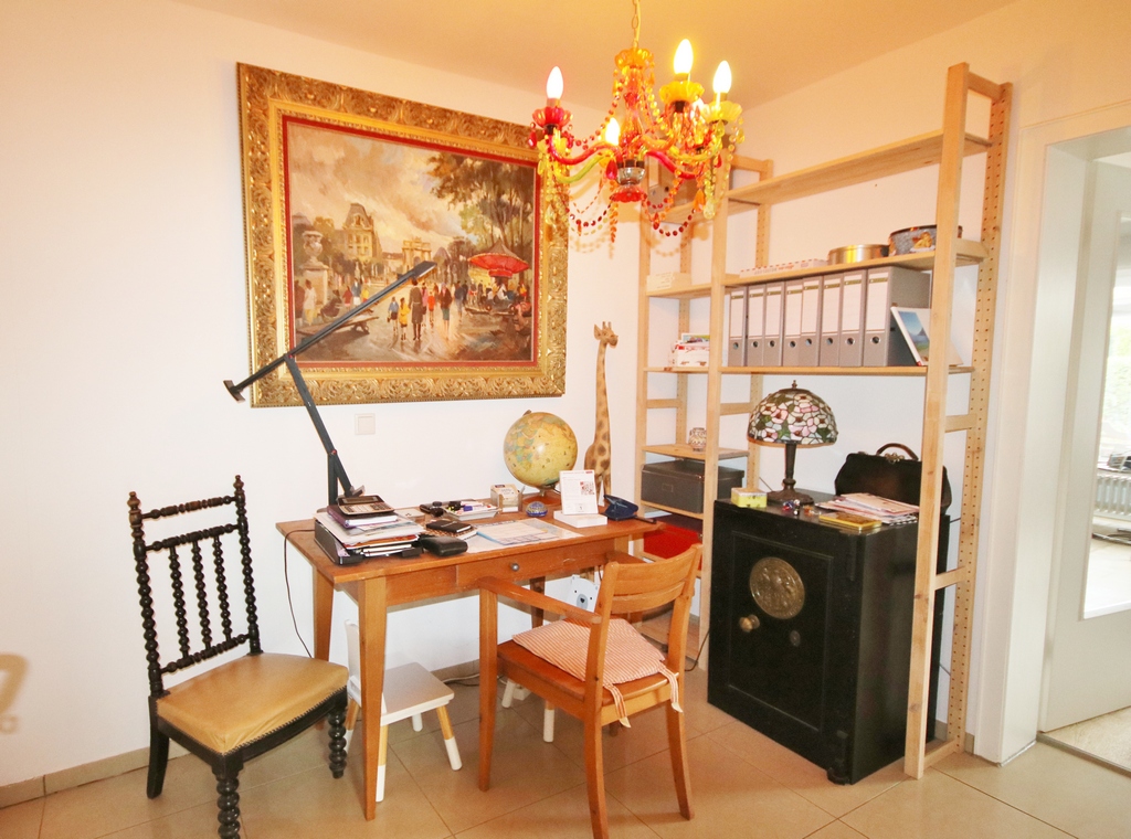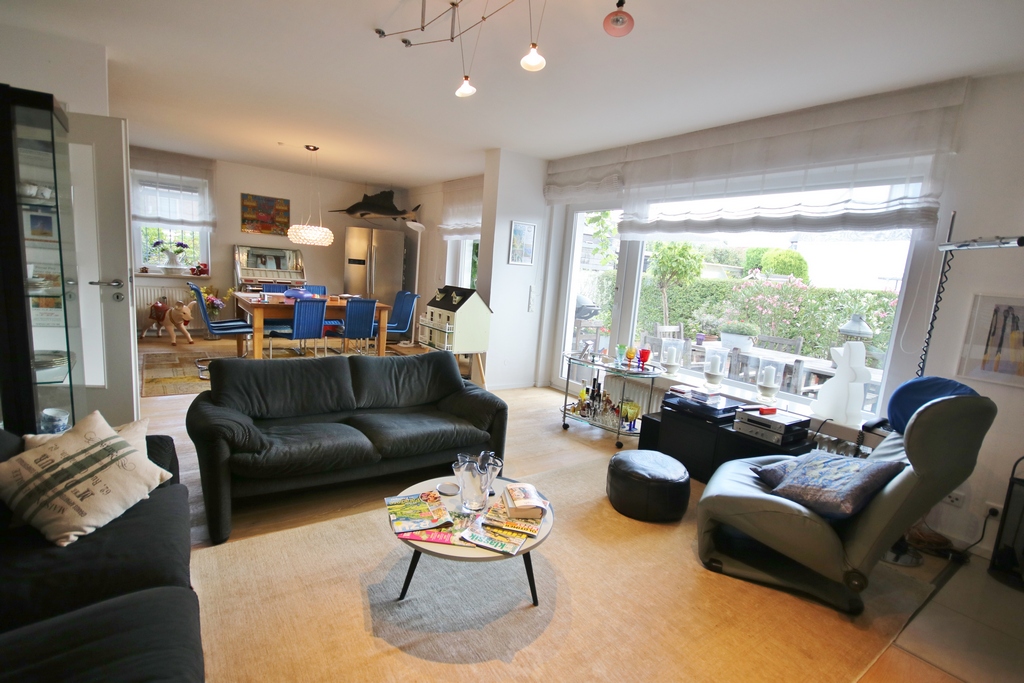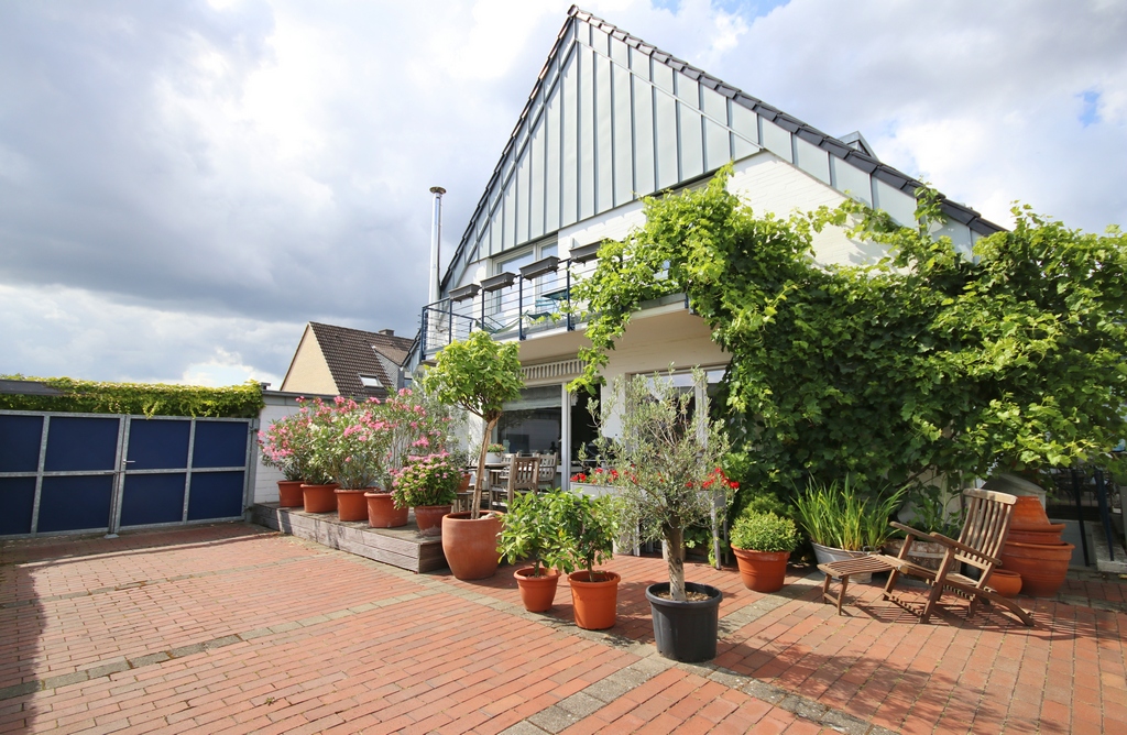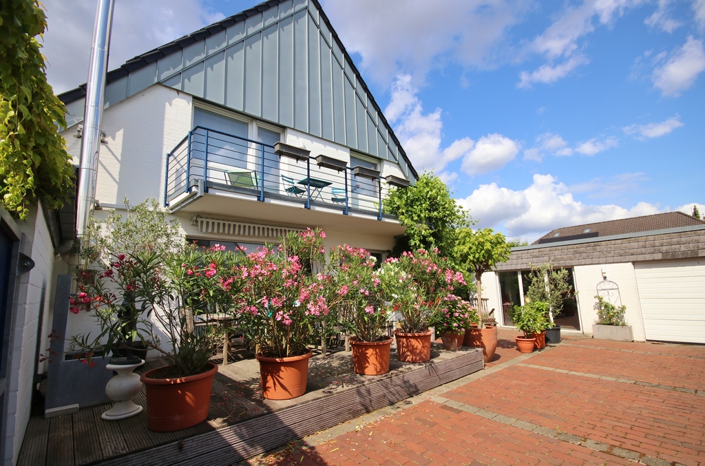 Sowohl der offene Wohn- und Essbereich im Erdgeschoss mit direktem Zugang zu zwei liebevoll gestalteten, sonnigen Terrassen als auch die privaten Rückzugsorte in der oberen Wohnebene und im ausgebauten Spitzboden garantieren ein gehobenes Wohnambiente. Die gesamte Grünanlage befindet sich geschützt im hinteren Grundstückbereich und bietet mit der überdachten Terrasse ein Refugium der Ruhe. Hinter einem Doppelflügeltor, das Privatsphäre schützt, liegt der schön gestaltete Innenhof mit einer eleganten Terrasse, der Garage und einem Atelier. Dieser Bereich ist ideal für Familien und Kinder, die hier ungestört spielen können.